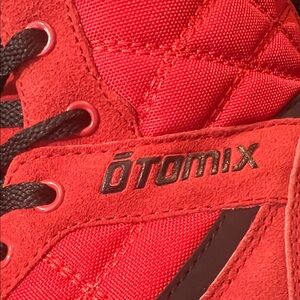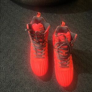 Vibrant red high-top shoes commonly used for weightlifting, bodybuilding, MMA wrestling, and other Martial Arts.