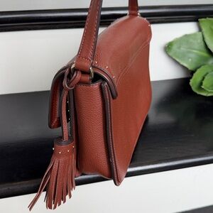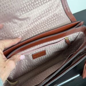 This Kate Spade genuine leather crossbody shoulder purse is crafted from soft, luxurious pebbled leather with beautiful stud detailing around the front flap. This bag arrived to retailstore damaged with some leather plucking on the front. (See photos) some TLC could possibly make this bag appear more “perfect”.The warm neutral tone makes this bag incredibly versatile and easy to carry year-round.The adjustable shoulder strap is smooth and comfortable to wear in new condition.Hardware is intact and functions properly. The strap allows you to wear this bag comfortably as a shoulder or crossbody style.The fold-over flap opens to a well-designed interior with multiple compartments for organizing, including open sections and a zipper pocket. The interior lining is immaculately clean and appears unused. The Kate Spade nameplate is present inside, and there are no stains, odors, or signs of wear to the lining. From a non-smoking home.