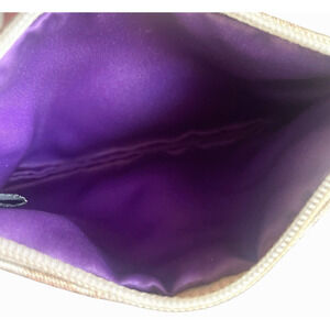 COACH Light Khaki/Gold Signature C Canvas Leather Trim Zip Wristlet Bag. Top Zip Closure. Wrist Strap. Iconic Gold COACH Hang Tag 6.5" x 4". Purple Fabric Interior. Gold Hardware. Very Good Condition. Ships within 24 hours.