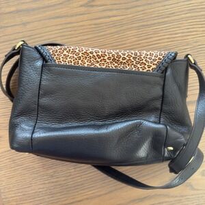 Authentic Aimee Kestenberg Genuine Fur leather crossbody bag featuring a black pebbled leather body with a leopard print genuine fur (haircalf) flap and whipstitched trim. Structured envelope-style silhouette with snap-button foldover closure and adjustable crossbody strap.