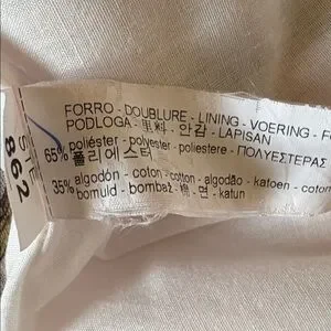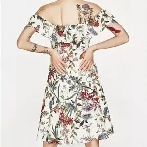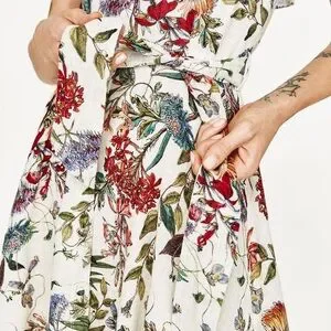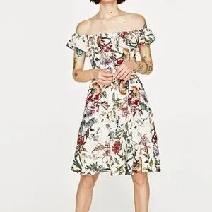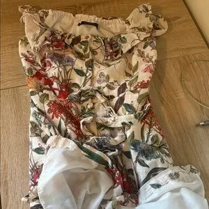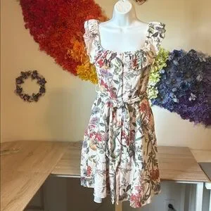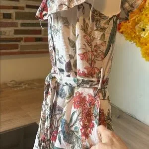 Multi color floral print over light cream. Material has a subtle woven handfeel. On seam pockets. Fully lined. Elasticized off the shoulder neckline. Buttons down the front. Sash detail. 88% cotton 12% viscose Lining: 65% polyester 35%cotton