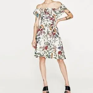 A structured silhouette meets expressive print in this off-the-shoulder midi dress. Designed with ruffled sleeves and a fitted bodice, it balances softness with precision. The vibrant floral motif adds contrast to the clean lines, while the flared skirt introduces subtle movement. Finished with black slide sandals for understated edge.