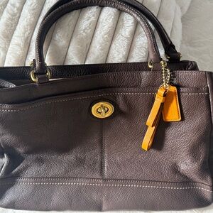 Sophisticated dark brown leather satchel. Features gold hardware and a stylish design. Ideal for everyday use.