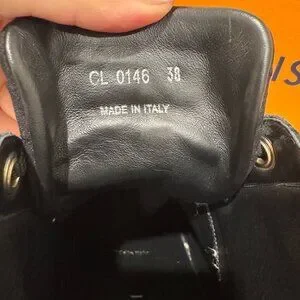 Material: Black suede + monogram canvas + patent leather heel detail