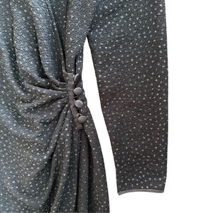 Vintage 1990s Reggio wrap-style mini dress in classic black with subtle sparkle accents throughout. Designed with a flattering V-neckline, long sleeves, and side button closures that cinch the waist for an adjustable, figure-enhancing fit.