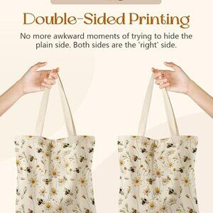 Floral Bumble Bee Canvas Tote Bag with Pockets - Aesthetic Reusable Totes