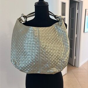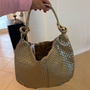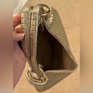 Stylish gold leather metallic woven shoulder bag. Perfect for any occasion. Measurements 15×12×2.