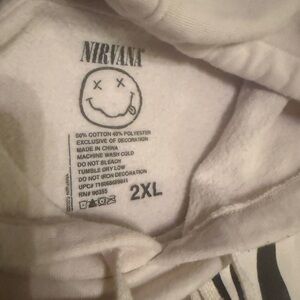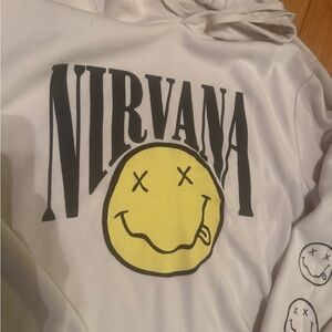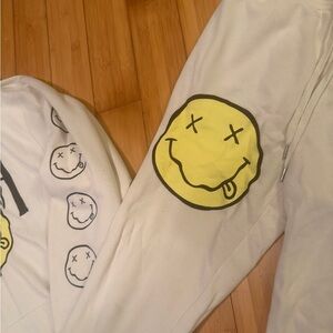 NIRVANA apparel featuring iconic smiley face. Soft cream fabric.