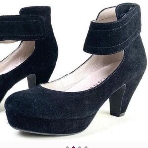 Chic black heels with a stylish ankle strap. Features a comfortable block heel. Ideal for versatile wear.