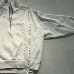 Stylish quarter-zip sweatshirt. Soft and comfortable. Perfect for casual wear. Excellent condition except for a very faint stain on the sleeve. See pictures for details