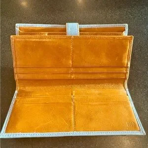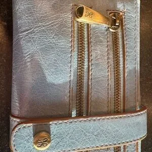 Chic light blue leather clutch by HOBO. Features stylish gold zippers and accents. Perfect for versatile use. Matching shoulder bag in separate listing. Lovely for Spring.