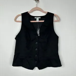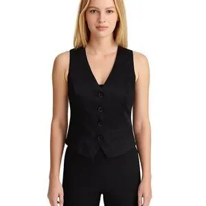 workwear, office, business casual, career, meeting outfit, executive style, classic, timeless, elegant, chic, sophisticated, modern, minimalist, polished, refined, classy, feminine, versatile, stylish, high-quality, upscale, sleek, elevated, professional, evening, dressy, vest, tailored waistcoat, black, jet black, solid, smooth woven fabric, structured fit, office attire, business casual, evening wear, timeless classic, menswear-inspired, chic, sophisticated, elegant, versatile, trendy, stylish wardrobe essential
