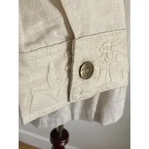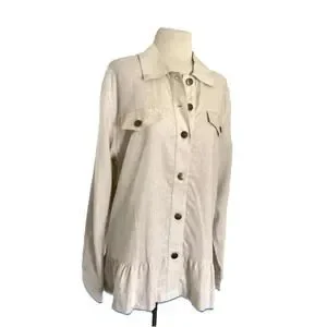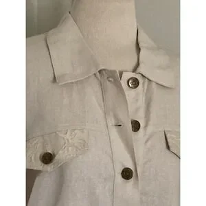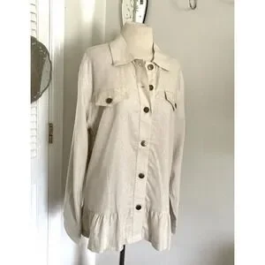 The beige color and lace fabric type with ruffle accents give it a feminine touch. It comes in size 12 and is a relaxed fit, making it comfortable to wear all year round. The collared jacket also features pockets for added convenience. This jacket is suitable for all seasons, whether it's winter, summer, fall, or spring.