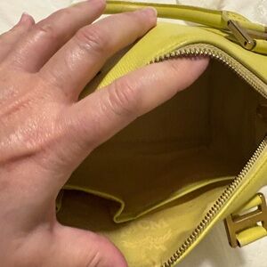 Chic MCM satchel in lime green leather. Features gold-tone accents. Stylish and functional.