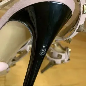 Chic heels with black pointed toes and tan straps. Adorned with signature studs for a bold look.