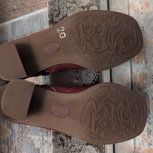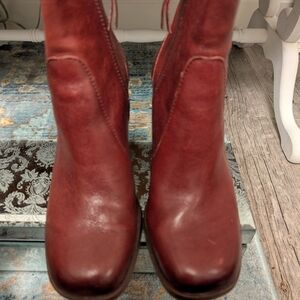 Elegant burgundy ankle boots. Features side zipper. Stacked heel for added height.