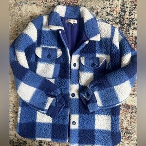 Pre-loved. Good condition. Pictures provided. Wild daisy, Cozy warm sherpa jacket with a blue and white plaid pattern. Size L 12/14. Features button closures and chest pockets.