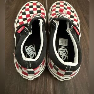 Classic checkered design. Easy slip-on style. Comfortable fit for kids. GUC. Not very noticeable staining on the left shoe (see last pic)
