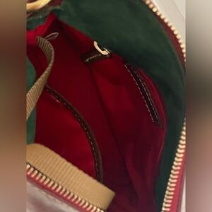 Gorgeous small version of D&Bs great Florentine leather purse. One interior zip and slip pocket. Color is a darker brown (photo #1 is the truest color). Red fabric interior with green suede accent.