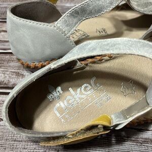 Rieker Silver closed in sandal shoe hint of gold strap Step out in style with these elegant gray leather shoes. Perfect for any occasion, they offer both comfort and sophistication. Preowned like new shoe. See photos. Size 39/8