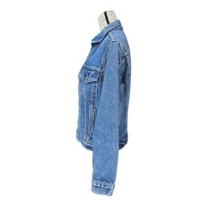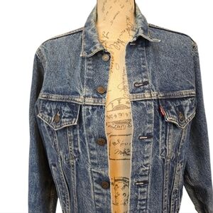 Levi's blue denim button vintage trucker jean jacket. Classic denim, side and front chest pockets. Vintage paper patch tag with "Made in USA" origin and specific vintage details. Excellent used condition.