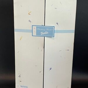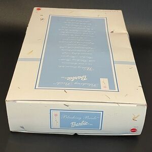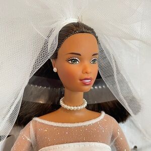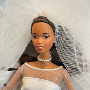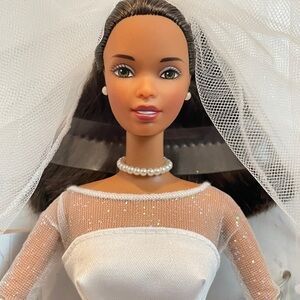 Barbie Blushing Bride Doll. Features a stunning white gown. Silver accents add elegance. Ideal for collectors.
