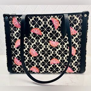 Beautiful Kate Spade New York canvas jacquard tote featuring the iconic spade pattern with playful embroidered grapefruit slices and sleek black leather trim.