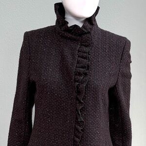 Elegant dark purple tweed wool coat from DKNY in a rich cabernet tone, featuring a refined silhouette with distinctive ruffle detailing along the front placket and collar. Tailored and polished, this coat balances classic structure with feminine design, making it equally suited for work, evenings, or dressed-up casual wear. The textured tweed fabric adds depth and interest while remaining timeless. This coat has been very rarely worn and is in Like New condition, with no flaws noted. Clean, well cared for, and stored in a smoke-free home.