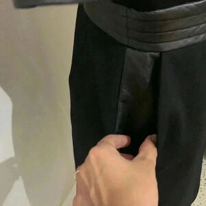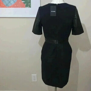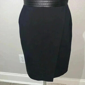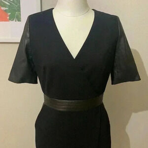 The Kooples Hopla Leather-Trim Faux Wrap Dress size 36 European which equal US size 8 or Medium Leather Elbow-Length Sleeves Leather Waist Two Front Pockets Center Back Zipper With Hook-And-Eye Closure Shell: 65% Viscose 30% Polyamide 5% Elastane Lining: 68% Acetate 21% Polyamide 11% Polyester Trim: 100% Bust 17" Length 36" Waist 13.5"