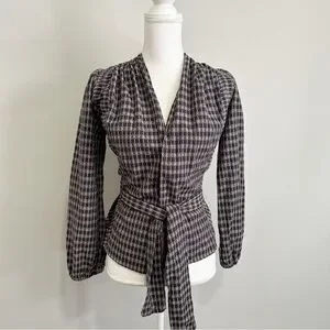 Chic checkered blouse with a wrap tie. Long sleeves and V-neck design. Perfect for versatile styling.