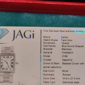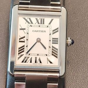 Authentic Cartier Tank Solo Large watch in stainless steel with a classic rectangular case and elegant white dial featuring bold black Roman numerals and blue sword-shaped hands. Finished with Cartier’s signature blue cabochon crown and fitted on a stainless steel bracelet. Powered by a precise Swiss quartz movement for reliability.