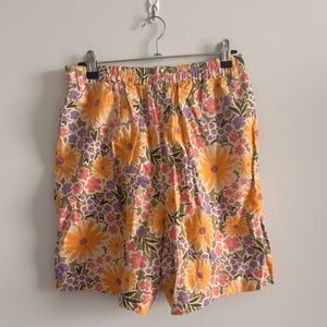 Bright floral shorts with a mix of orange, pink, and purple flowers. Fabric is a cotton linen blend. Ideal for sunny days.
