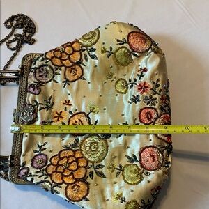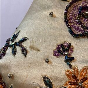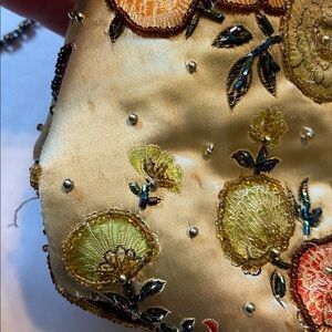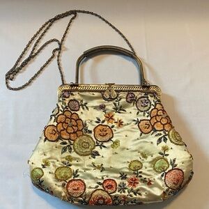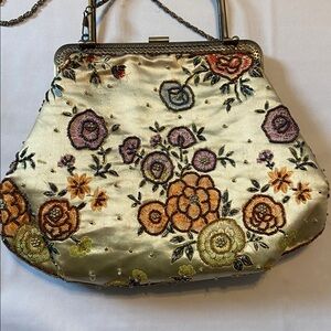 For sale is this vintage beaded and embroidered purse. This purse has metal handles and a metal shoulder strap that can be put inside the bag if you choose to use the handles. It also has a metal clasp at the top. The metal is a bit tarnished but I didn't want to clean it in case the buyer wants that vintage look. This purse is lined, and there is a little staining inside on that lining. The bag has a zippered compartment on the one side.