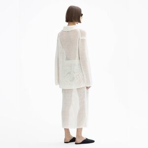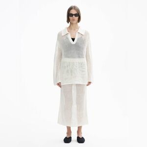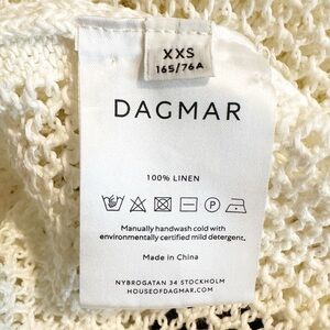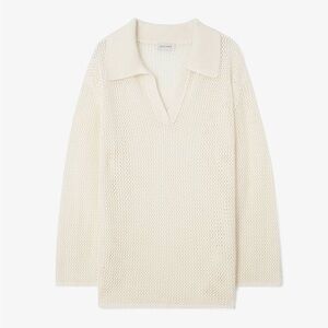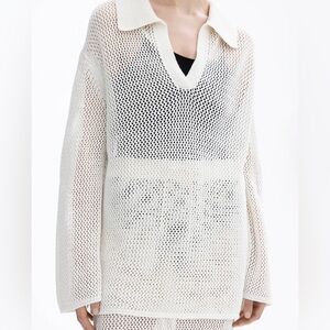 Dagmar crochet sweater, Dagmar knit top, linen crochet pullover, open knit sweater, Scandinavian minimalist style, luxury resort wear, airy knit linen top, spring summer knit, oversized crochet sweater, designer linen top, Swedish fashion brand, mesh knit polo sweater, quiet luxury