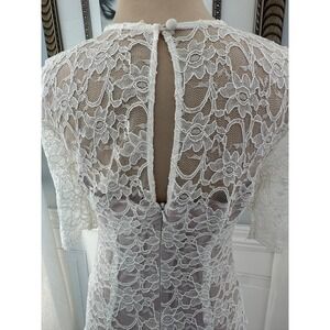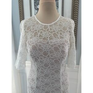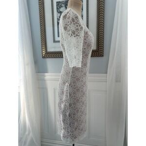 Elegant and easy to wear, this JAX white lace sheath midi dress features an allover floral lace overlay with a nude lining for a clean, modern look. Designed with a high neckline, elbow-length sleeves, and a back zip closure, it is a polished option for bridal events, rehearsal dinners, cocktail parties, or wedding guest occasions.