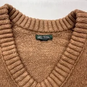 Wild Fable V-neck sweater in a warm brown cognac hue offers a relaxed, oversized silhouette perfect for layering. Crafted from 100% recycled polyester, this knit piece features a classic ribbed V-neckline, dropped shoulders, and wide ribbed cuffs and hem for a cozy, textured look. The medium-weight knit provides a comfortable drape, making it a versatile staple for casual autumn and winter wardrobes.