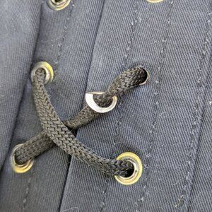 Measurements when cinched, approximately 12.5" when measured across the middle between 2nd and 3rd hooks) from left side rib to right side rib. Approximately 10.25" from top to bottom on the hooked side and approximately 11.5" from top to bottom on the laced side. From a smoke free home. Offers welcome.