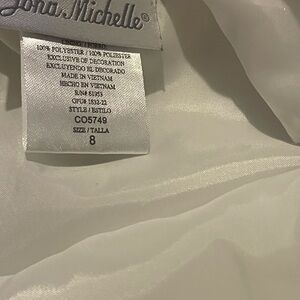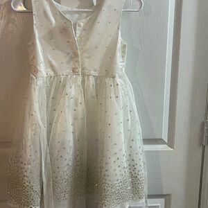 Charming ivory dress with gold sparkle details. Ideal for formal events. Features a stylish gold belt.