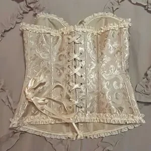 Chic NWOT gold and cream corset with lace-up, size S. Features delicate ruffle trim. Perfect for stylish layering.