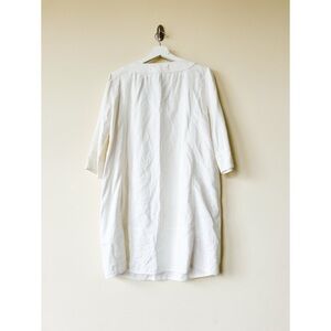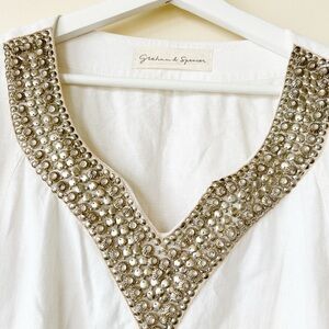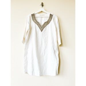 Elegant white linen blend dress with a stunning embellished V-neck. Perfect for a stylish summer day
