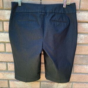 dark navy stretch lightweight tailored Bermuda shorts. 12 in inseam. Front pockets. Flat wide waistband