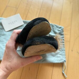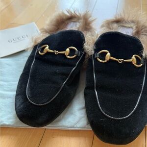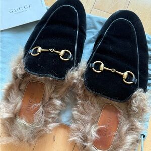 Elegant black loafers with brown fur trim. Iconic Gucci design. Perfect for stylish comfort.
