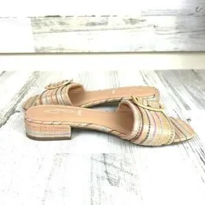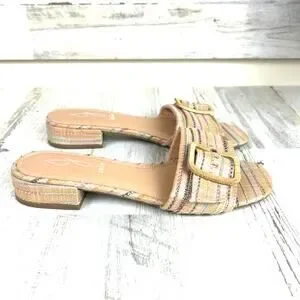oie women’s size 7.5 Claire flat sandals in multicolor striped woven fabric. These slip-on sandals feature a chic buckle accent and easy slide-on design, blending casual comfort with designer style. Perfect for summer wear, vacations, or weekends, they pair effortlessly with dresses, skirts, or shorts. A versatile sandal with Joie’s modern boho-inspired touch.