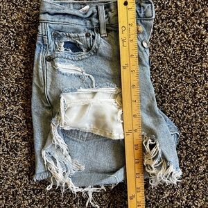 These stylish distressed denim shorts from American Eagle Outfitters are perfect for a casual day out. Featuring a classic blue color, they offer a trendy and comfortable fit.