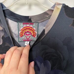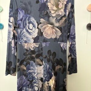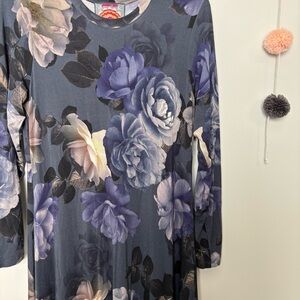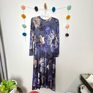 Embodying relaxed femininity, the Grey Peony Long Sleeve Tee Dress drapes gracefully thanks to its fluid construction. Made from a lightweight fabric with a touch of stretch, this dress boasts a round neck, long sleeves, and an exquisite selection of open blooms in various blue tones. Finish off the look with simple extras and flats to brunch with friends. Bold floral and fun. Size medium. Great condition!