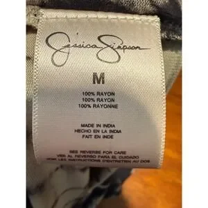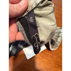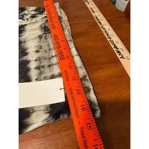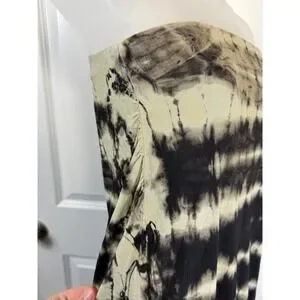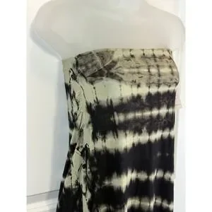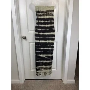 Jessica Simpson Jet Black Tie Dye Maxi Dress Size Medium Joy. This flowing maxi dress features a striking black and off-white tie-dye pattern throughout. The fabric has a soft, comfortable feel, and the dress includes subtle ruching details on one side for added texture and shape. The strapless design creates a sleek silhouette perfect for a variety of casual or dressed-up looks.