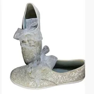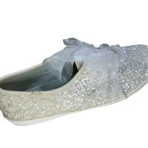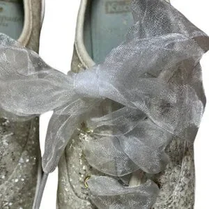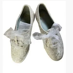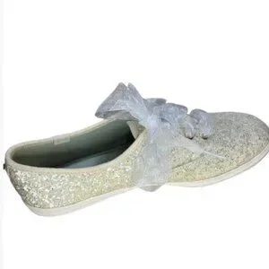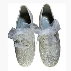 This collab between Kate Spade and Keds delivers the cutest pair of glittery women's kicks around! Made with silver glitter and laced with sheer white ribbons, these sneakers have maximum appeal. Ribbons are not original to these sneakers.