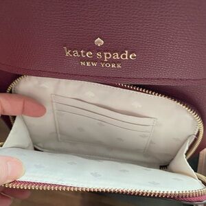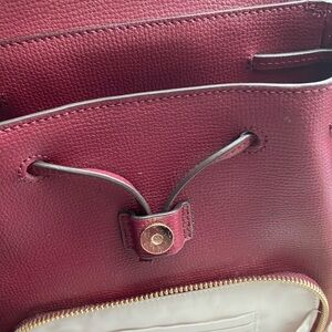 Elegant kate spade backpack in deep red. Features a sleek design with a built in zipper wallet on the front with 3 card slots. Main compartment with a drawstring closure. Gold hardware. Perfect for daily use. Interior perfect. In new condition.
