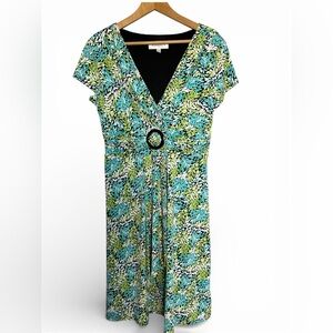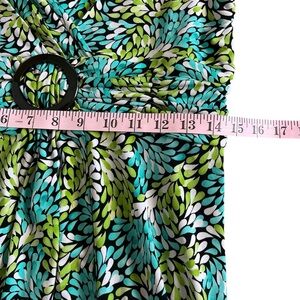 Chic dress with vibrant leaf pattern. Features a flattering V-neck design with soft folds at the waist, accented with a black faux buckle. Flow-y and feminine with stretch for comfort. Perfect for your spring and summer wardrobe. Excellent condition, no visible flaws. Elevate your workwear for the office or any other occasion. Please see photos for approximate measurements. Women's size 16.