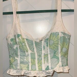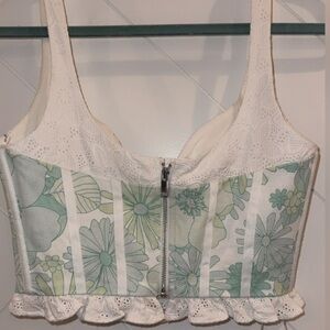 For Love & Lemons Peyton corset bustier top in a soft floral print with delicate eyelet lace trim. This structured top features vertical boning for a flattering, supportive fit and a feminine sweetheart neckline. The cropped silhouette pairs perfectly with high-rise denim, skirts, or tailored trousers for a chic, elevated look.